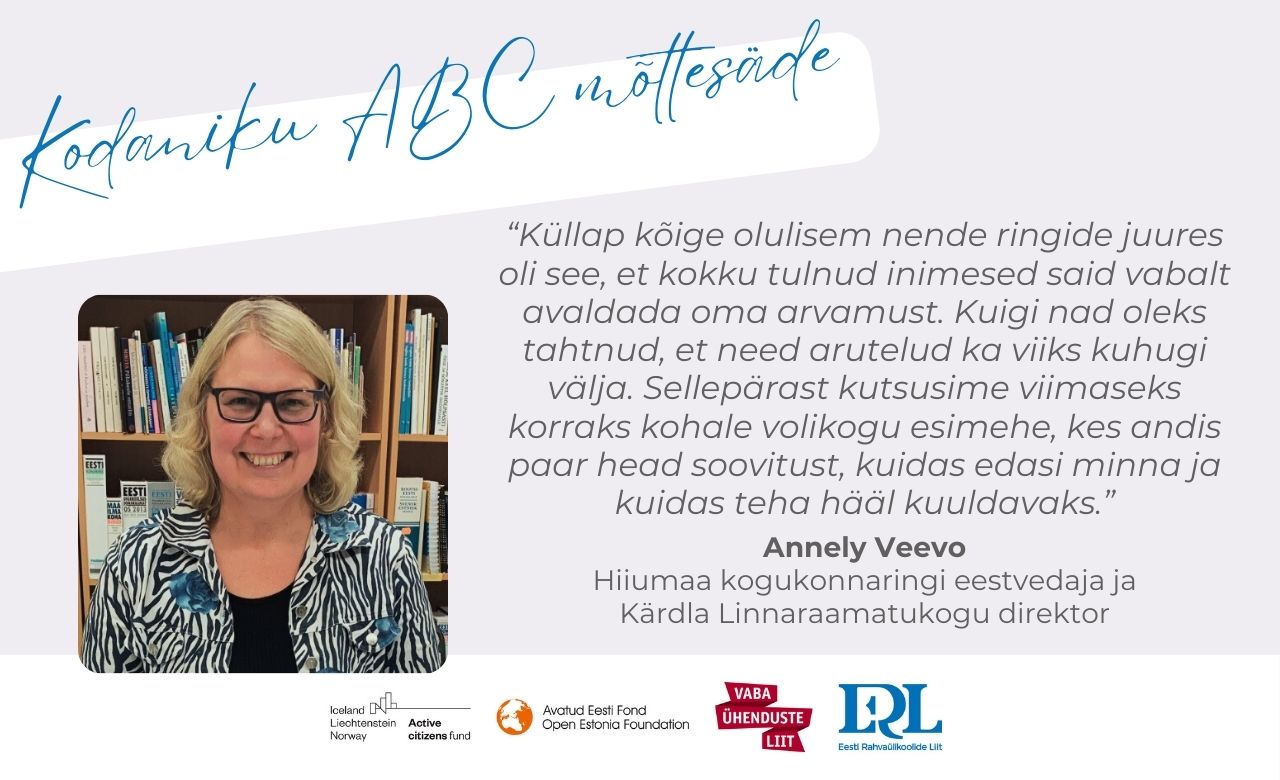 🤹♀️ “Inimeste avamine sõltub usaldusest üksteise ja grupijuhi vastu,” räägib Hiiumaa kogukonnaringi eestvedaja, Kärdla raamatukogu juht Annely Veevo. Ta ütleb, et tal oli nende paari kuu vältel, mis Hiiumaa kodanikuhariduse õpiring koos käis, selle võrra lihtsam, et ta teadis 90% grupi liikmetest. “Lihtne oli grupijuhtimine ka selle võrra, et ei pidanud ise tegelema organisatoorse poolega,” ütleb Annely.
