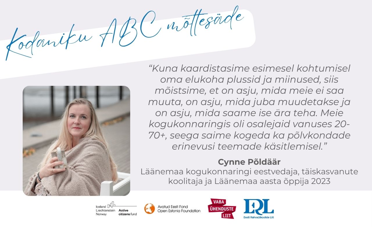 👩🎨 “Kuna kaardistasime esimesel kohtumisel oma elukoha plussid ja miinused, siis mõistsime, et on asju, mida meie ei saa muuta, on asju, mida juba muudetakse ja on asju, mida saame ise oma heaolu jaoks ära teha. Meie kogukonnaringis oli osalejaid vanuses 20-70+, seega saime kogeda ka põlvkondade erinevusi teemade käsitlemisel,” räägib Läänemaa kogukonnaringi eestvedaja, täiskasvanute koolitaja ja Läänemaa aasta õppija 2023 Cynne Põldäär.