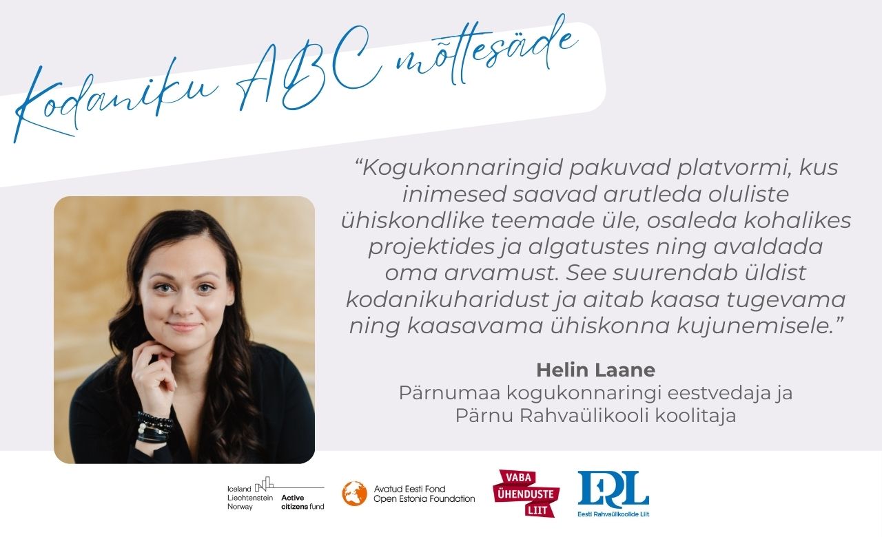 👩 “Nooruses olin väga aktiivne ja osalesin erinevates ühendustes, nagu näiteks õpilasesindus, Pärnu Noorte Liit, kooliraadio ja ajaleht,” räägib Pärnumaa kogukonnaringi eestvedaja Helin Laane Pärnu Rahvaülikoolist. Pärast gümnaasiumi keskendus ta aga rohkem õpingutele, hiljem perele ja tööle. “Kogukonnaringi eestvedamine andis mulle võimaluse taas panustada ühiskonda ja olla taas ka ise aktiivne kodanik,” märgib ta.