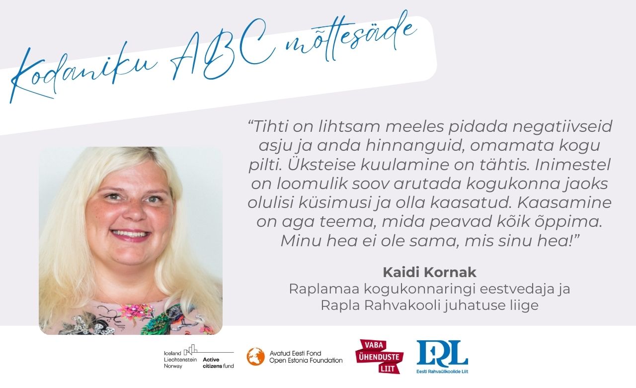 👂 “Tihti on lihtsam meeles pidada negatiivseid asju ja anda hinnanguid, omamata kogu pilti. Üksteise päriselt kuulamine on tähtis. Teise muresid ei pisendata ja ei anta hinnanguid. Inimestel on loomulik soov arutada kogukonna jaoks olulisi küsimusi, olla kaasatud ja koosloomes teha asju paremaks. Kaasamine on aga teema, mida peavad kõik õppima. Minu hea ei ole sama, mis sinu hea!” rõhutab ta, viidates ühele kohtumiste õpimomendile.