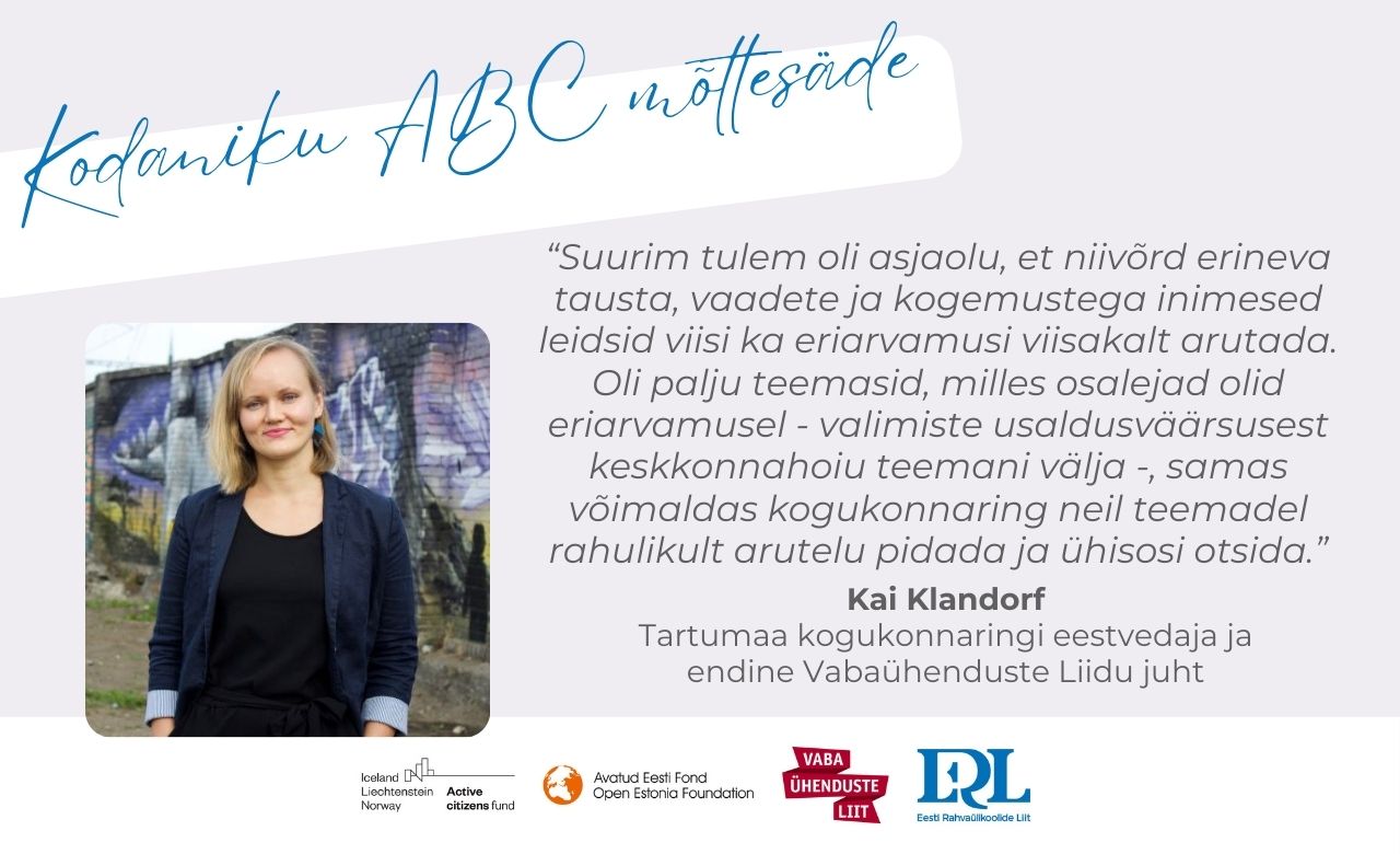 👩💼 “Suurim tulem oli üldse asjaolu, et niivõrd erineva tausta, vaadete ja kogemustega inimesed leidsid viisi ka eriarvamusi viisakalt arutada,” sõnab Tartumaa kogukonnaringi eestvedaja, endine Vabaühenduste Liidu tegevjuht Kai Klandorf. Selles õpiringis oli palju teemasid, milles osalejad olid eriarvamusel – valimiste usaldusväärsusest keskkonnahoiu teemani välja, põhjendab Kai. “Samas võimaldas kogukonnaring neil teemadel rahulikult arutelu pidada ja ühisosi otsida.”
